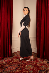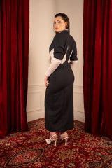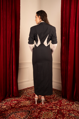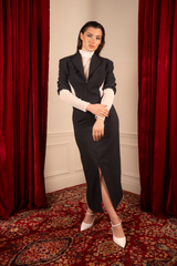 Cette robe-tailleur revisite les codes du pouvoir au féminin. Structurée par des épaules larges et affirmées, elle s’adoucit par de subtils empiècements en dentelle, qui viennent souligner le col et le décolleté avec délicatesse. Chaque découpe a été pensée pour suivre et sublimer les lignes naturelles du corps, créant une silhouette nette et affirmée. Les manches, volontairement retroussées, évoquent une décontraction maîtrisée. La longueur de la pièce est ajustable sur demande, tout comme la couleur de la dentelle, disponible en blanc ou en noir selon l’envie.